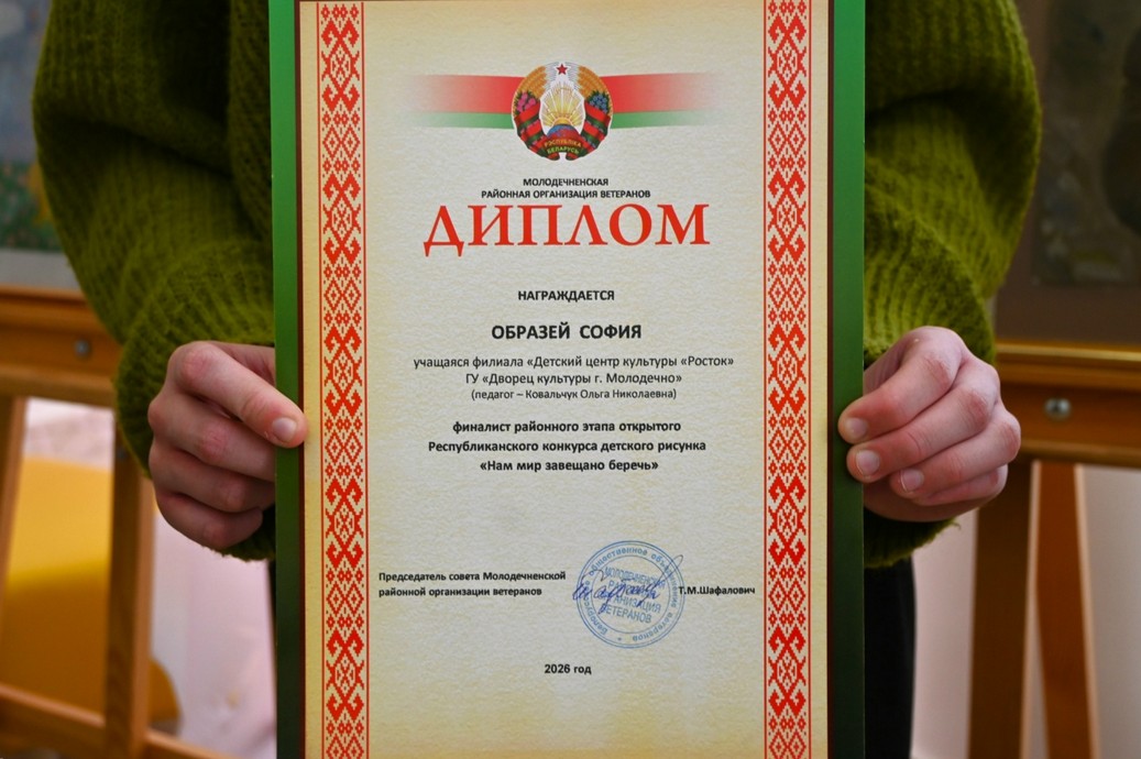 16.03.2026Поздравляем воспитанницу образцовой студии изобразительного искусства "Чароўная палітра" Софию Образей, которая стала финалисткой районного этапа открытого Республиканского конкурса детского рисунка "Нам мир завещано беречь". Благодарим руководителя студии Ольгу Ковальчук за подготовку участницы!