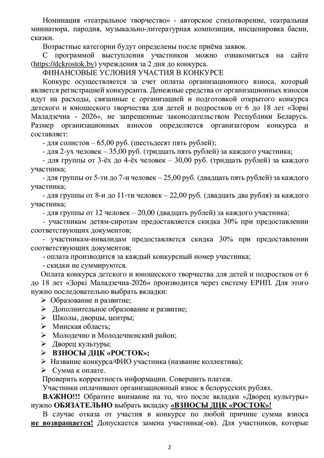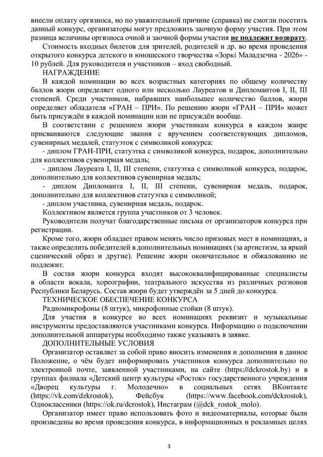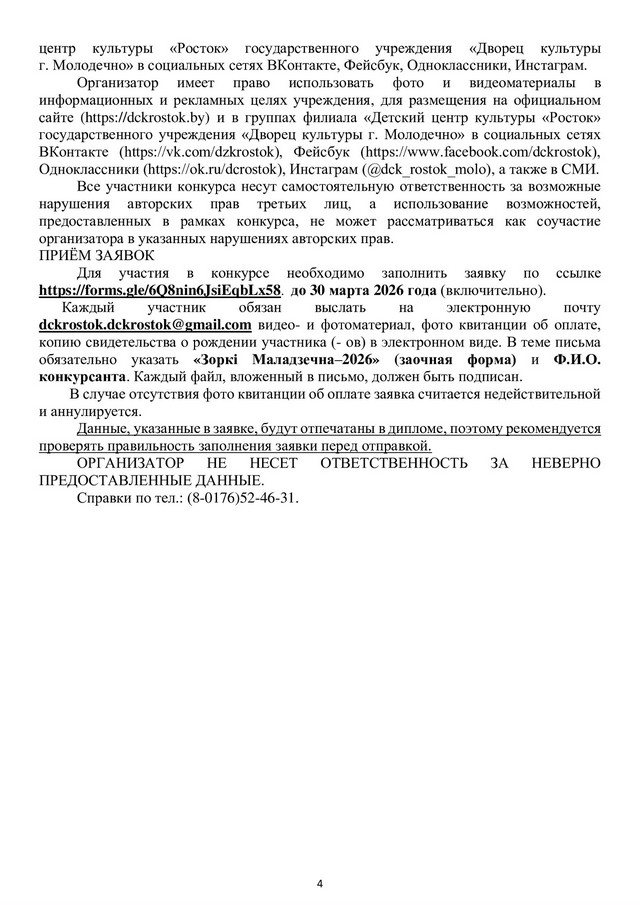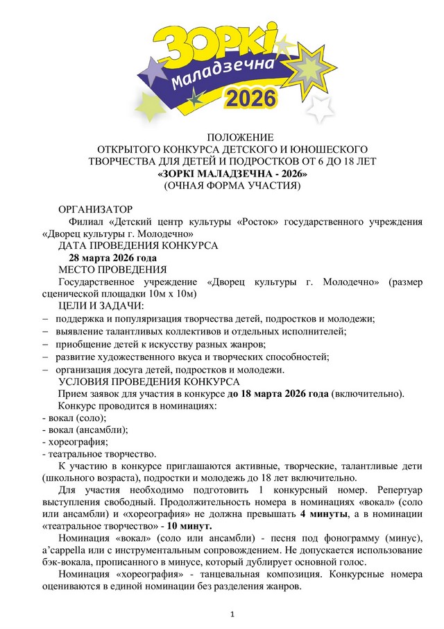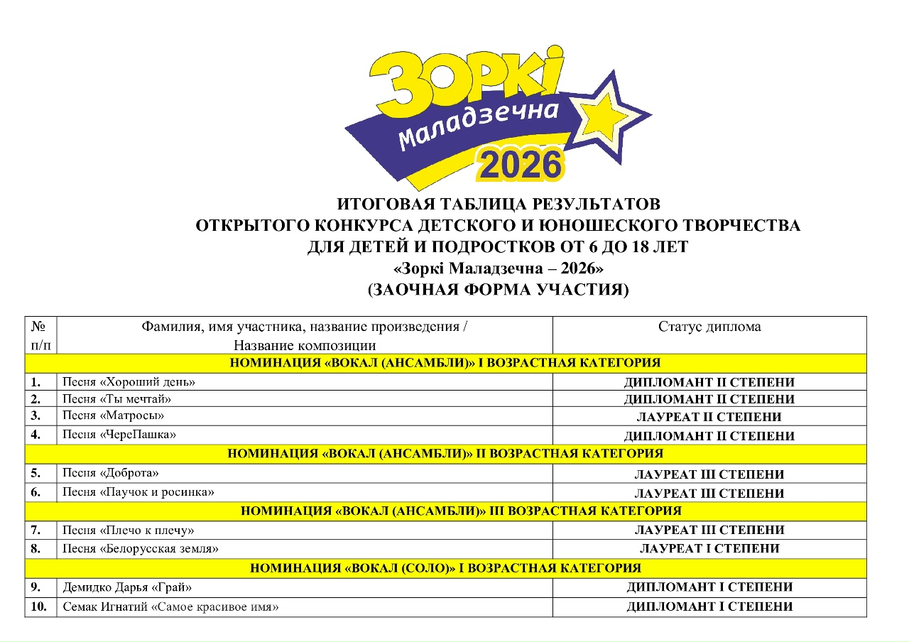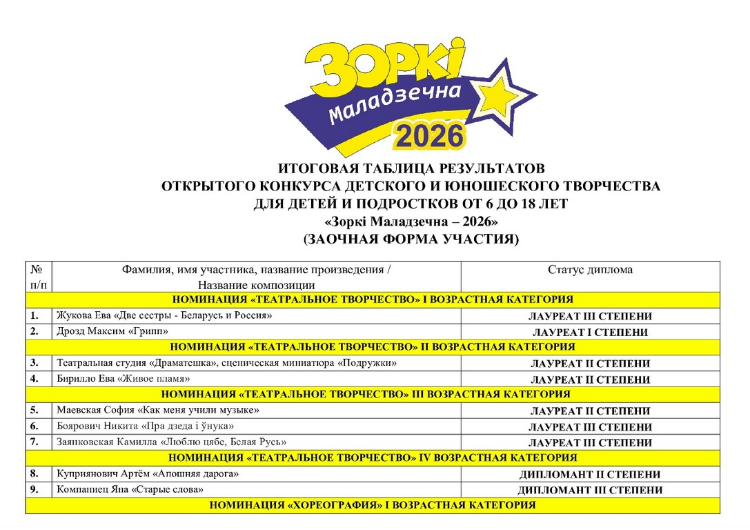 Дорогие друзья! Подведены итоги открытого конкурса детского и юношеского творчества для детей и подростков от 6 до 18 лет «Зоркі Маладзечна – 2026» (заочная форма участия).Таблица результатов находится здесь