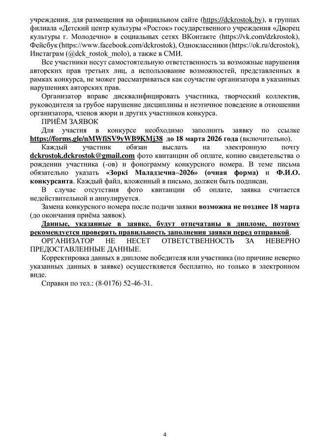 Благодарности для руководителей участников открытого конкурса детского и юношеского творчества «Зоркі Маладзечна - 2026» (заочная форма)